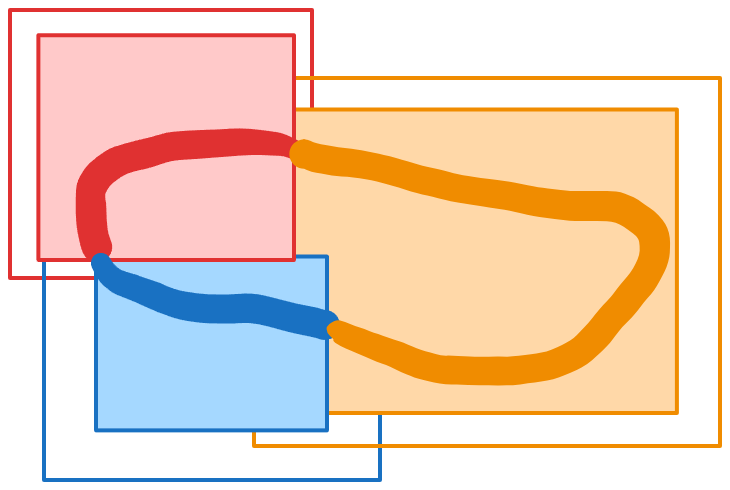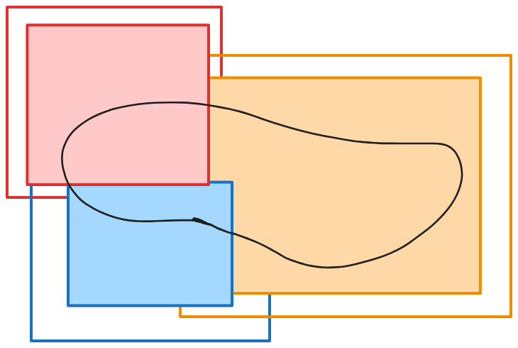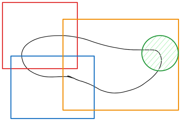 A tiling scheme over a region in black - notice how the tiles overlap significantly. Red, blue, and orange are the tiles in the tiling scheme. The green circle around the edge of the region is entirely contained inside the orange tile. One way of creating this overlap-by-ε condition is to generate tiles that are exactly adjacent, or overlap a little, and expand them all by ε in all directions. That’s why we call this the bleed - we’re basically bleeding over each tile a bit in each direction.